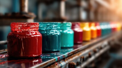A vibrant array of paint jars showcased on a production line, featuring bold colors and textures that highlight creativity and artistic potential in diverse mediums.