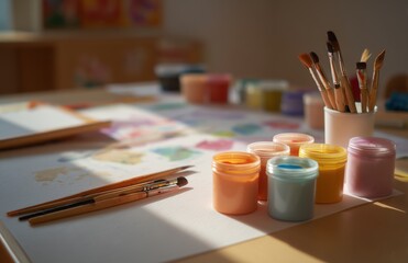Colorful painting supplies on art studio table