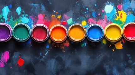 Vibrant paint pots bursting with color on a splattered black canvas. Ideal for art supply ads or creative project promotions.