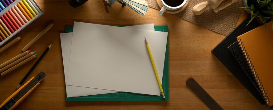 Color pencils frame surrounding art supplies top view