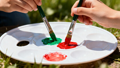 Artist in creative process holding paintbrushes