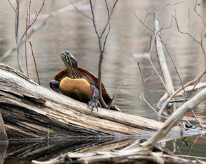 Painted Turtle Photo Stock. Close-up standing on a log with blur water background in the pond environment and habitat. Image. Picture. Portrait.