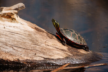 Western Painted Turtle (Chrysemys picta) crawling on a log in summer