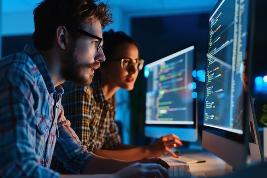 Collaborating developers debugging code on dual monitors in moody late-night tech workspace