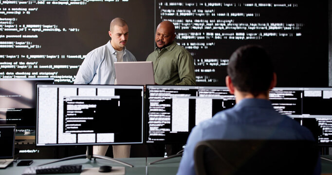 diverse AI developers collaborate in a late-night coding session. A senior engineer mentors his colleague as they program a complex machine learning algorithm together.