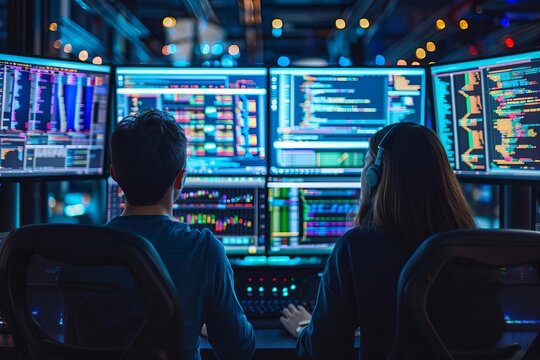 A diverse duo of AI developers in a pair programming session, analyzing a complex algorithm. A concept for teamwork, software engineering, and developing future technologies.