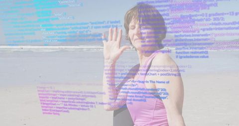 Senior woman waving and stretching on sandy beach with programming code overlay