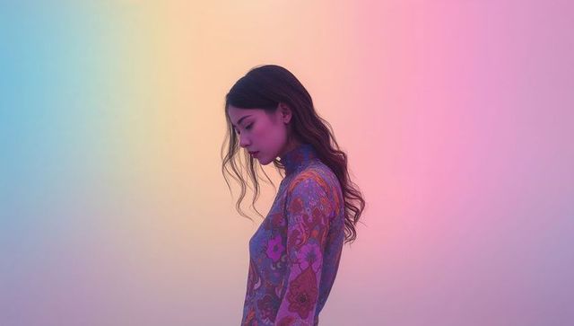 Serene woman standing in profile bowing head wearing patterned dress on pastel gradient