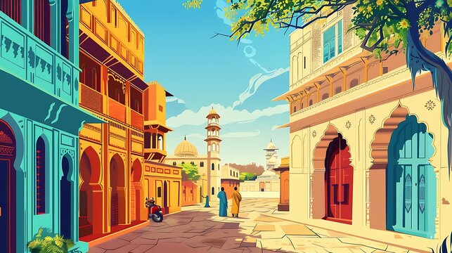 An artistic vector representation of a Pakistani street scene with vibrant colors and traditional architecture.