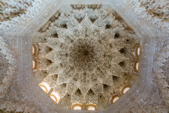 Beautiful decorated interior ceiling and pillars of the Durbar or audience hall inside the royal Mysore Palace