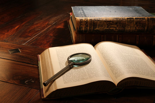 Book pages with an Arabic manuscript on a table with a light and a magnifying glass. Paleography, the study of ancient Arabic writing