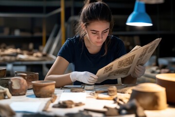 Young Archaeologist Studying Ancient Text in Artifact Lab
