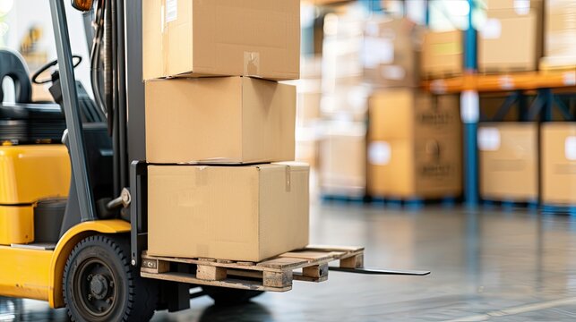 A forklift stands in a busy warehouse with rows of shelves stacked with boxes, while a pallet with three boxes sits in the foreground.