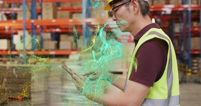 Warehouse worker walking scanning tablet with ar hud for smart inventory management and logistics