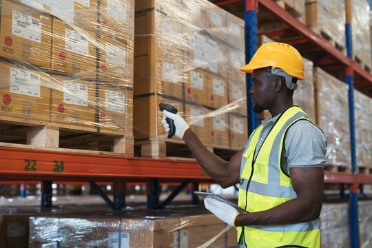 Man African American professional worker wearing safety uniform and white hard hat using bar code reader scanning box inspect product on shelves in warehouse.