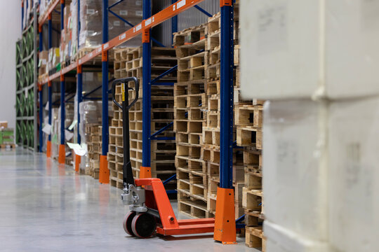 An orange manual pallet jack is parked on a concrete floor next to stacks of empty wooden pallets. The pallets are stored under tall blue and orange industrial racks in a modern warehouse.