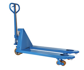 A worker in a warehouse uses a hand pallet stacker to transport pallets.