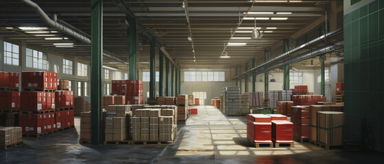 Modern warehouse interior featuring organized shelving and stacked cardboard boxes in a large storage facility