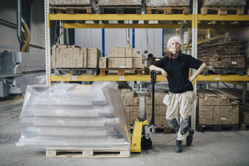 Working at warehouse. Low angle view of unrecognizable worker lifting palette with manual forklift.