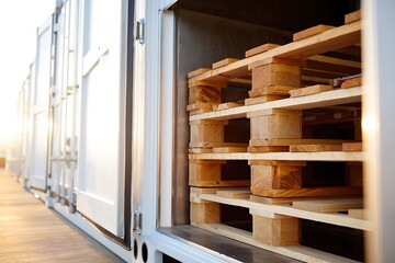 Stacked pallet boxes warehouse aisle with soft lighting and calm atmosphere