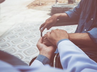 Elderly female hand holding hand of young caregiver at nursing home.Geriatric doctor or geriatrician concept. Doctor physician hand on happy elderly senior patient to comfort in hospital examination