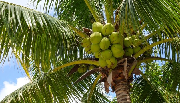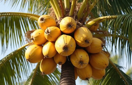 Ripe yellow coconuts cluster on palm tree branch under sunny sky. Green palm leaves form natural background in tropical location. Harvested fruits ready for consumption or processing.
