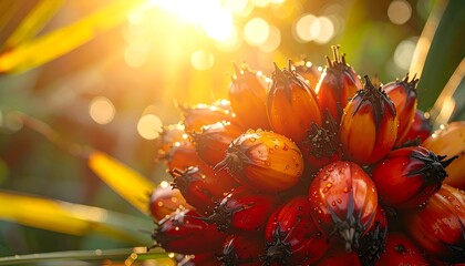 Close-up of palm fruit cluster bathed in warm sunlight, with blurred green background