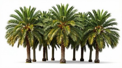 Dense tropical palm trees cluster isolated on white background with lush foliage for design use