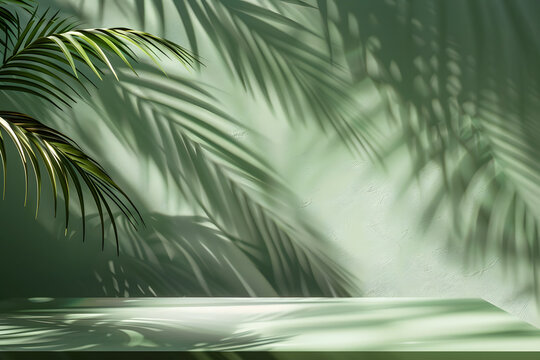 green background with tropical leaves and their shadow on the walls. empty studio for presentation. product demonstration