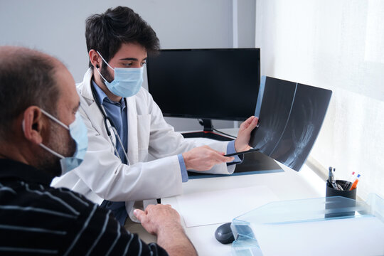 Young doctor examining x-ray of hands of a senior patient with arthritis. Radiography of a hand.
