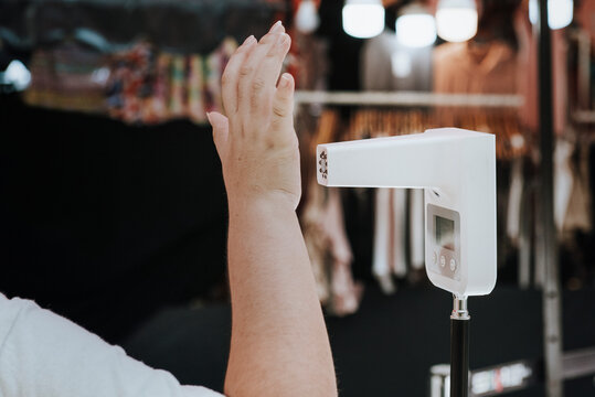 Customer raised hand at digital thermometer with temperature scanning machine for fever before entering area. Screening to prevent infected people from entering restricted areas. Covid-19 concept.