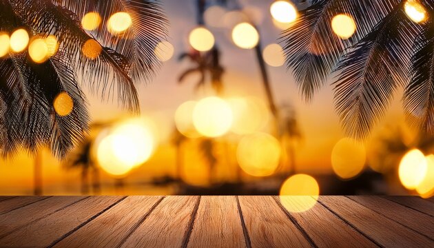 A tropical sunset with string lights illuminating palm trees and a wooden table in the foreground