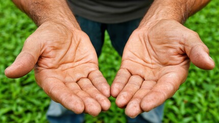 Open hands held out with palms facing up against a lush green background