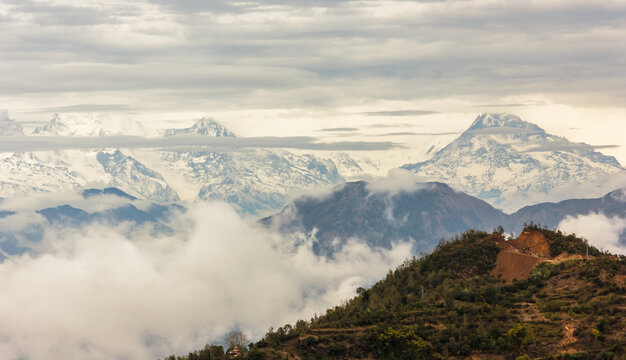 A dramatic view of the snowcapped Annapurna range seen from the Himalayan town of Tansen in Nepal.