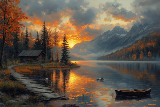 Serene Mountain Sunset:  A picturesque cabin nestled by a tranquil lake, bathed in the warm glow of a breathtaking sunset, with snow-capped mountains in the background. The serenity of nature is palpa