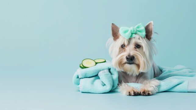 Westie Terrier dog in spa day attire.