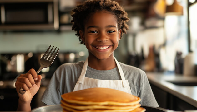 A joyful child stands in a kitchen, proudly holding a fork beside a stack of delicious pancakes. The scene captures a warm and inviting breakfast atmosphere.