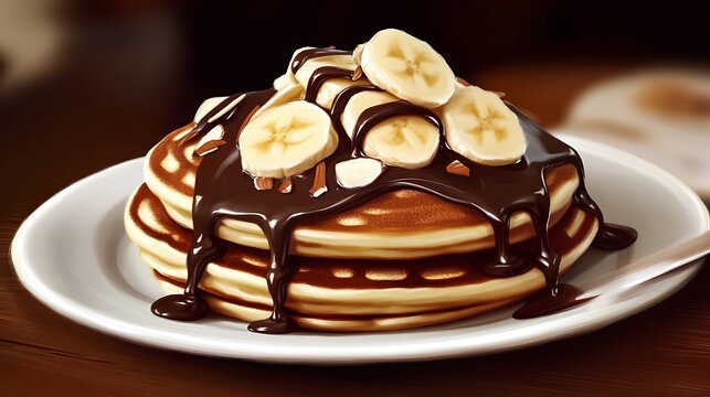 Pancakes. Homemade fluffy pancake with banana, walnut and caramel for breakfast on dark wooden background. Delicious pancakes for traditional American breakfast. Selective focus. Mock up.