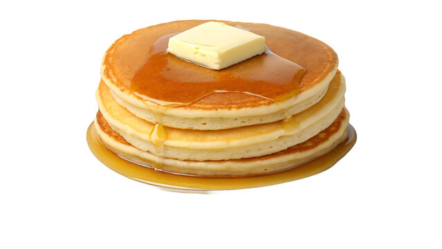 Stack of pancakes with butter and a flowing maple syrup on white