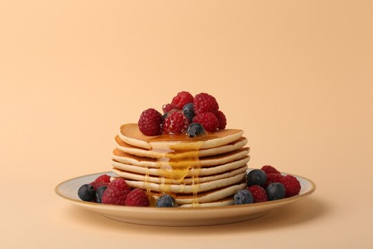 Healthy pancake breakfast topped with fresh fruit and maple syrup