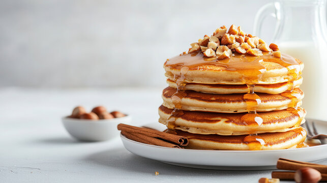 Selective focus on pumpkin pancakes with syrup on a plate placed on a table with copy space image available