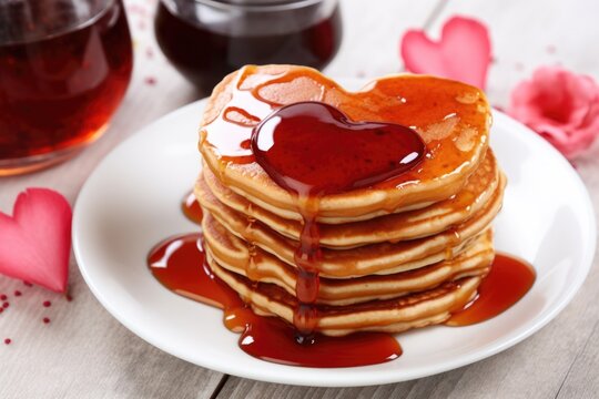 Culinary enjoyment with syrup pancakes for happy couple at breakfast