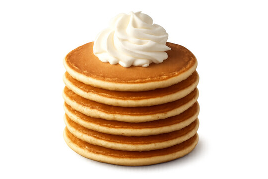 Fluffy pancakes stacked high with melted butter and syrup drizzling down on a plain background