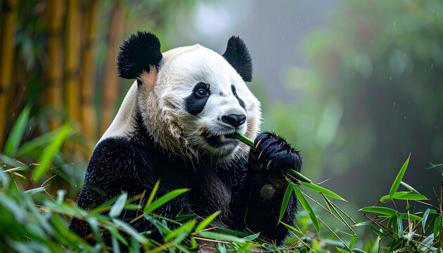 panda eating bamboo Shows a panda lying down. Full-frame composition, black-white tone. Realistic style, wildlife background