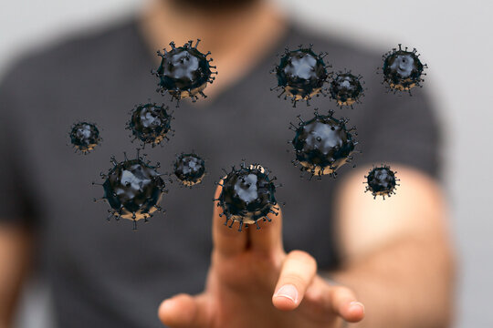 Digital illustration of a man's finger touching viruses, a concept for illness, infection and healthcare.