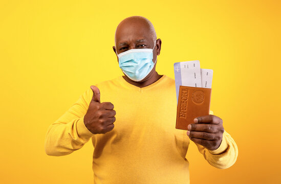 Senior African American man shows excitement for travel while holding his passport and tickets. He wears a face mask for safety against covid-19, showcasing positivity in challenging times.