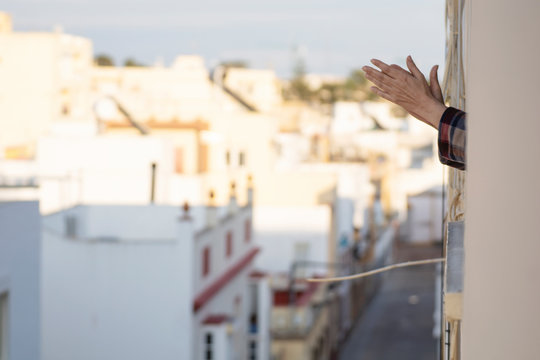 Hands of a woman applauding the health doctors at 20:00 during the confinement by coronavirus in Spain