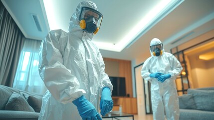 Healthcare professionals in protective gear disinfecting a living room in a modern apartment, ensuring safety and sanitation during a health crisis and pandemic response