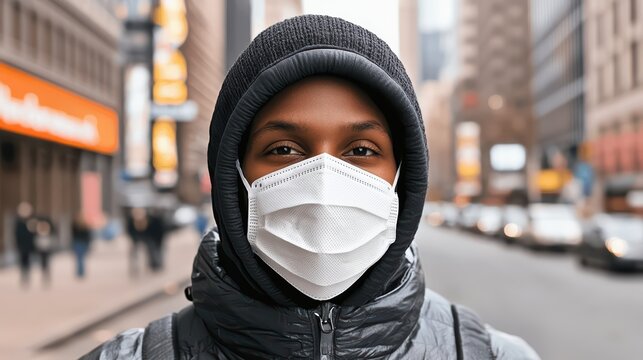 Young individual with mask and hoodie posing in urban setting during pandemic showcasing resilience and community spirit
