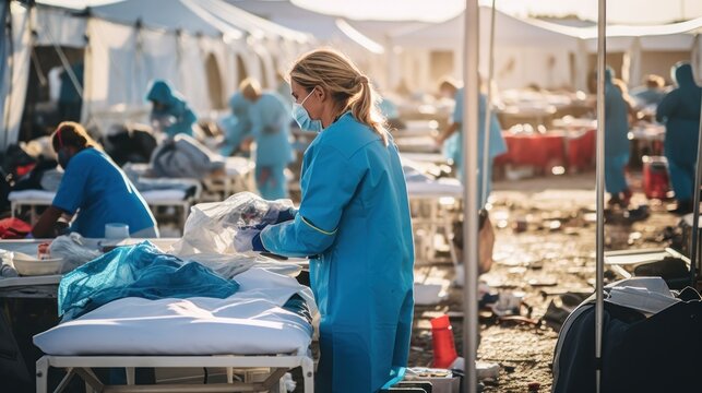 Healthcare workers providing medical care at a temporary field hospital